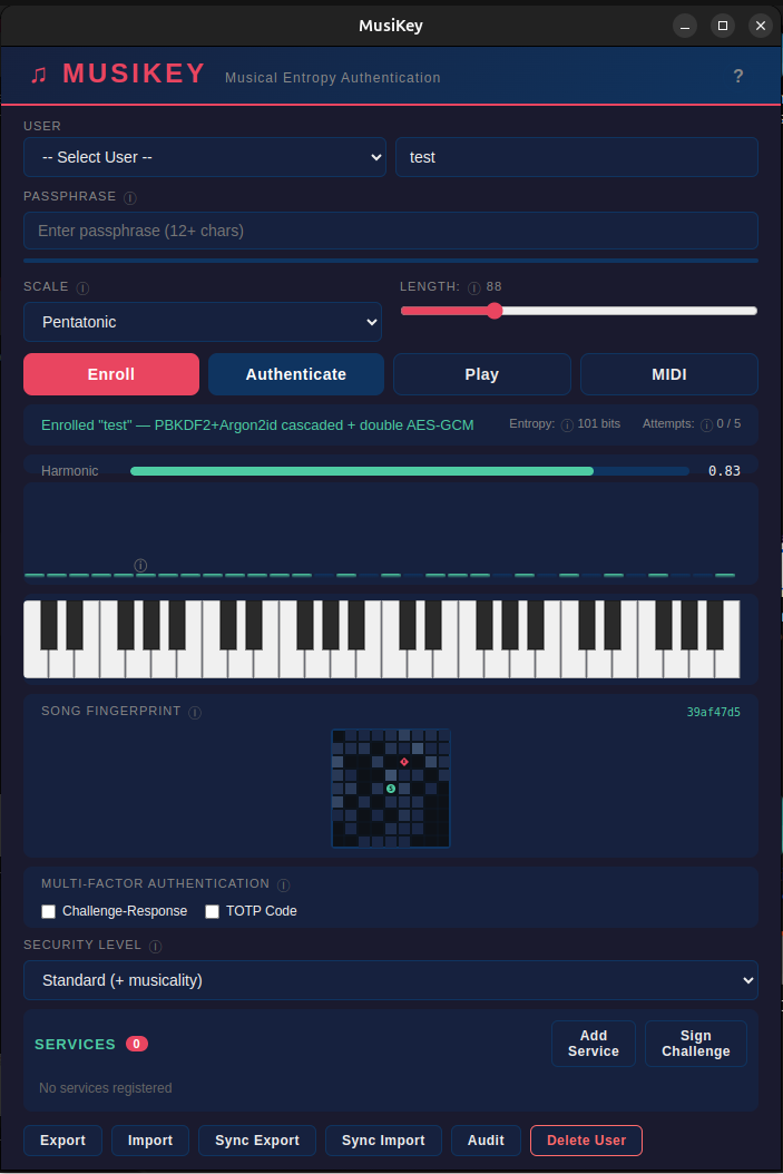 Core concept:Your password is a song. MusiKey turns musical compositions into cryptographic keys — play your own melody on a MIDI keyboard or let the system compose one for you. Audible, recognizable, and carrying 40-100+ bits of entropy.The Problem:Passwords are weak, reused, and forgettable. Hardware tokens are expensive and losable. Biometrics can't be changed if compromised. Authentication shouldn't require choosing between security and usability.How It Works:Enroll — Enter a passphrase and choose a musical scale. Play your melody on a MIDI keyboard or let MusiKey generate a unique composition. Your song is encrypted with cascaded key derivation and double-layer AES-256-GCM.Authenticate — Enter your passphrase. MusiKey decrypts your song, verifies musical integrity across four dimensions, and plays it back through an animated piano and frequency visualizer.Protect — Exponential rate limiting locks out attackers. Five failed attempts permanently destroy the credential. No recovery, no reset.Features:MIDI keyboard input — plug in any USB MIDI controller and play your own melody as your cryptographic key